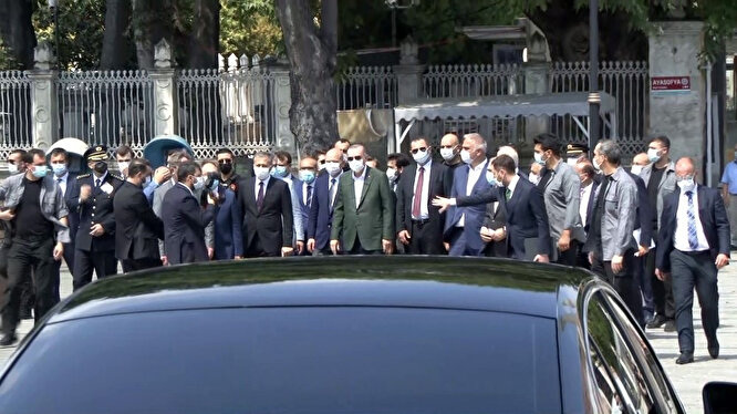 Erdoğan, incelemelerinin ardından Ayasofya Camisi'nden ayrılırken, vatandaşları selamladı.
