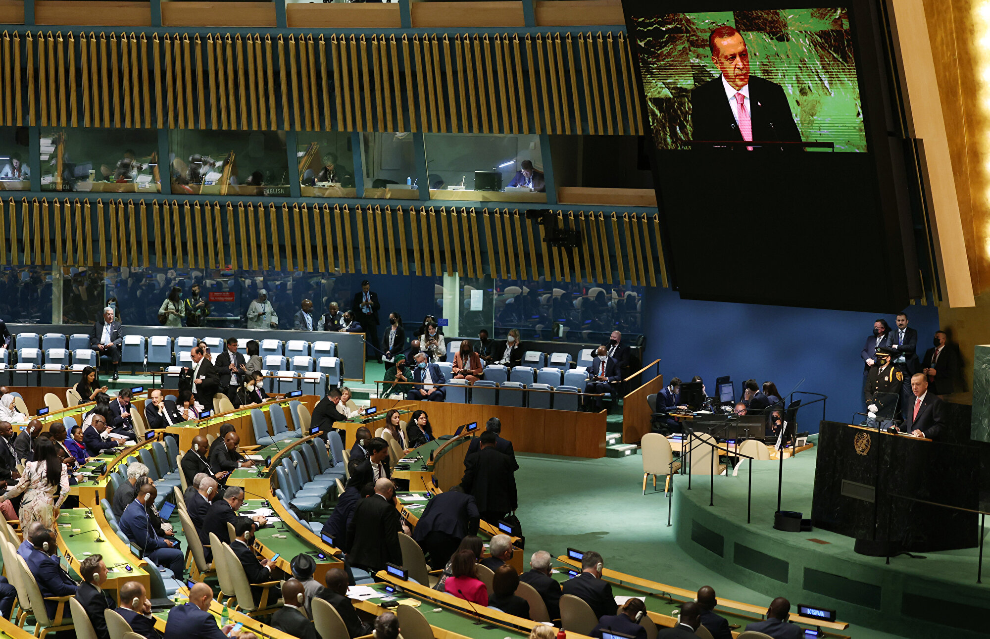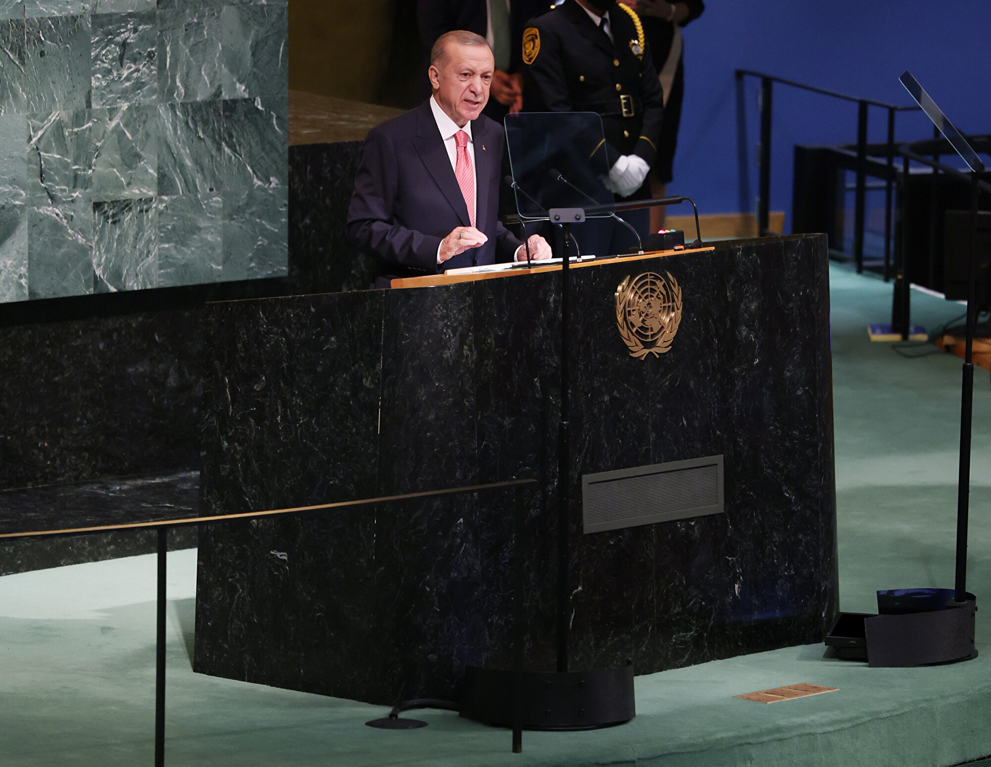 Cumhurbaşkanı Recep Tayyip Erdoğan Birleşmiş Milletler (BM) Genel Kurul Salonu'nda BM'nin 77. Genel Kurulu görüşmelerinde katılımcılara hitap etti.