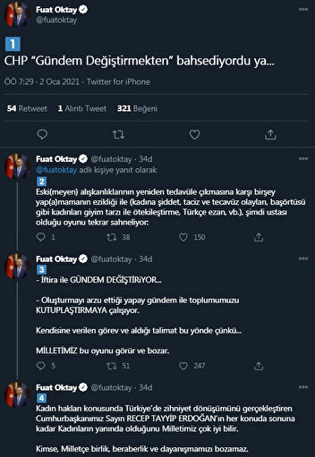 Oktay, açıklamasının devamında "İftira ile gündem değiştiriyor. Oluşturmayı arzu ettiği yapay gündem ile toplumumuzu kutuplaştırmaya çalışıyor. Kendisine verilen görev ve aldığı talimat bu yönde çünkü... Milletimiz bu oyunu görür ve bozar. Kadın hakları konusunda Türkiye'de zihniyet dönüşümünü gerçekleştiren Cumhurbaşkanımız Sayın Recep Tayyip Erdoğan'ın her konuda sonuna kadar kadınların yanında olduğunu Milletimiz çok iyi bilir. Kimse, Milletçe birlik, beraberlik ve dayanışmamızı bozamaz" dedi.