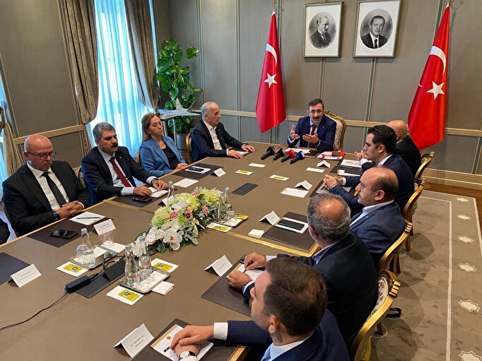Cumhurbaşkanı Yardımcısı Cevdet Yılmaz, Cumhurbaşkanlığı Külliyesi'nde Türkiye İşçi Sendikaları Konfederasyonu Başkanı Ergün Atalay, Hak İşçi Sendikaları Konfederasyonu Başkanı Mahmut Arslan ve Devrimci İşçi Sendikaları Konfederasyonu Başkanı Arzu Çerkezoğlu ile bir araya geldi. Yılmaz, basına kapalı gerçekleştirilen toplantı sonrası açıklama yaptı. Yılmaz, toplantının ana amacının eylül ayında paylaşmayı planladıkları Orta Vadeli Program ile ilgili tüm toplumsal kesimlerin fikirlerini almak ve bu fikirleri olabildiğince plana yansıtmak olduğunu söyledi. Türkiye'nin bir eşikte olduğunu belirten Yılmaz,