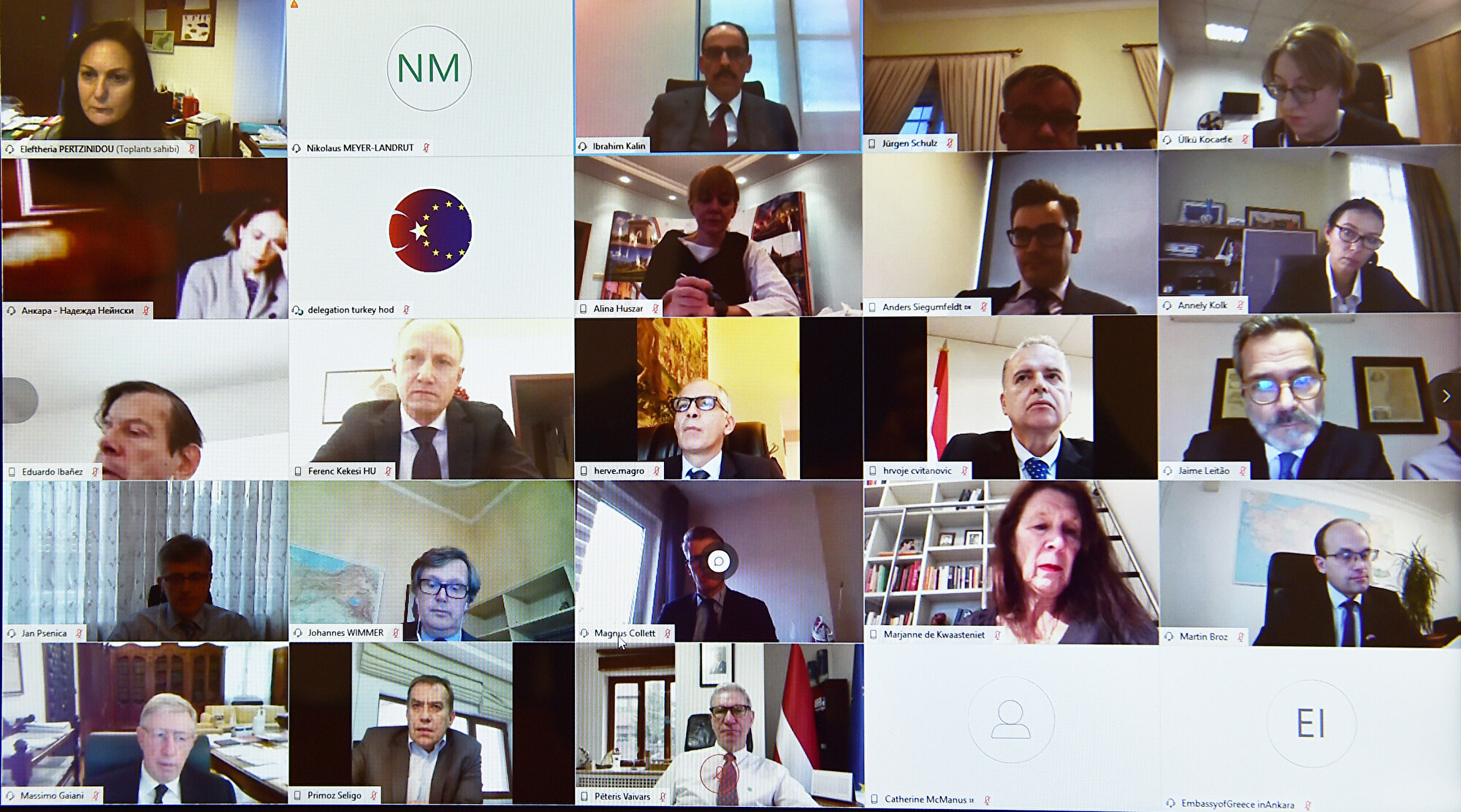 Cumhurbaşkanlığı Sözcüsü İbrahim Kalın, 27 Avrupa Birliği (AB) ülkesinin Ankara büyükelçileri ve misyon temsilcileri ile video konferans yöntemiyle bir araya geldi.