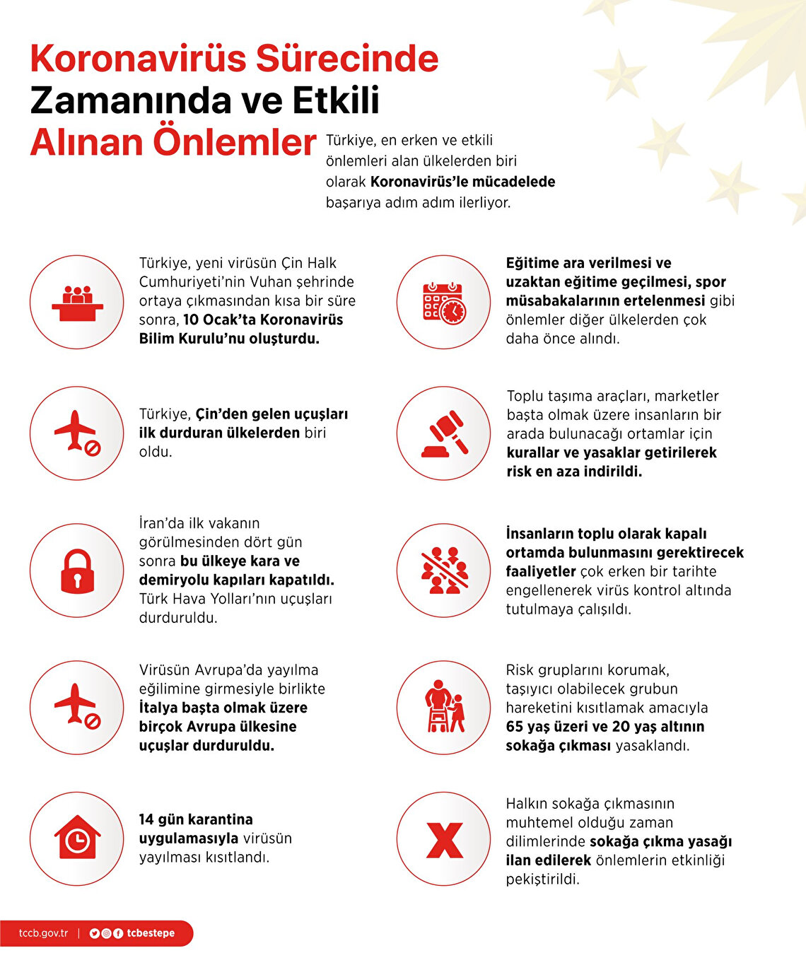 - "Türkiye, yeni virüsün Çin Halk Cumhuriyeti'nin Vuhan şehrinde ortaya çıkmasından kısa bir süre sonra, 10 Ocak'ta Koronavirüs Bilim Kurulu'nu oluşturdu. Türkiye, Çin'den gelen uçuşları ilk durduran ülkelerden biri oldu. İran'da ilk vakanın görülmesinden 4 gün sonra bu ülkeye kara ve demir yolu kapıları kapatıldı. Türk Hava Yolları'nın uçuşları durduruldu. Virüsün Avrupa'da yayılma eğilimine girmesiyle birlikte İtalya başta olmak üzere birçok Avrupa ülkesine uçuşlar durduruldu. 14 gün karantina uygulamasıyla virüsün yayılması kısıtlandı. Eğitime ara verilmesi ve uzaktan eğitime geçilmesi, spor müsabakalarının ertelenmesi gibi önlemler diğer ülkelerden çok daha önce alındı. Toplu taşıma araçları, marketler başta olmak üzere insanların bir arada bulunacağı ortamlar için kurallar ve yasaklar getirilerek risk en aza indirildi. İnsanların toplu olarak kapalı ortamda bulunmasını gerektirecek faaliyetler çok erken bir tarihte engellenerek virüs kontrol altında tutulmaya çalışıldı. Risk gruplarını korumak, taşıyıcı olabilecek grubun hareketlerini kısıtlamak amacıyla 65 yaş üzeri ve 20 yaş altının sokağa çıkması yasaklandı. Halkın sokağa çıkmasının muhtemel olduğu zaman dilimlerinde sokağa çıkma yasağı ilan edilerek önlemlerin etkinliği pekiştirildi."
