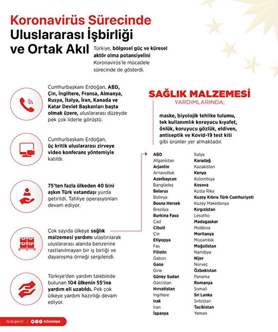 - "Cumhurbaşkanı Erdoğan, ABD, Çin, İngiltere, Fransa, Almanya, Rusya, İtalya, İran, Kanada ve Katar devlet başkanları başta olmak üzere uluslararası düzeyde pek çok liderle görüştü. Cumhurbaşkanı Erdoğan, 3 kritik uluslararası zirveye video konferans yöntemiyle katıldı. 75'den fazla ülkeden 40 bini aşkın Türk vatandaşı yurda getirildi. Tahliye operasyonları devam ediyor. Çok sayıda ülkeye sağlık malzemesi yardımı ulaştırılarak, uluslararası alanda benzeri rastlanılmayan bir işbirliği ve dayanışma örneği sergilendi. Türkiye'den yardım talebinde bulunan 104 ülkenin 55'ine yardım eli uzatıldı. Pek çok ülkeye yardım hazırlığı devam ediyor."
