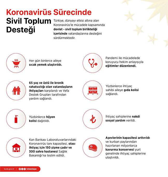 Türkiye'nin, koronavirüsle mücadele kapsamında devlet-sivil toplum birlikteliği içerisinde vatandaşlara desteğini sürdürdüğü belirtilerek, şöyle denildi: