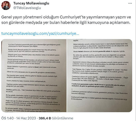 Cumhuriyet Gazetesi Genel Yayın Yönetmeni Tuncay Mollaveisoğlu, bugün yazısının gazetede yayımlanmadığını açıkladı. Söz konusu yazısını sosyal medya hesabından paylaşan Mollaveisoğlu, gazetenin para karşılığında haber yaptığını belirterek, "Bu ilişkiden sorumlu olanlarla ilgili gereğinin yapılmasını istedim. Gazete yönetimi bu ilişkiyi kuranları derhal uzaklaştırmalıydı. Yapılması gereken açıkça ortada durmasına rağmen tartışma, vakıf yönetiminde gereğinden çok uzun sürdü." dedi.