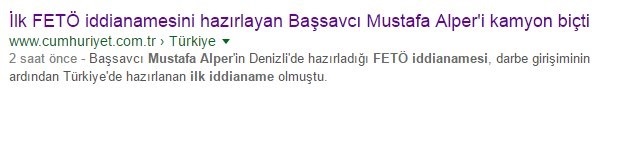 Cumhuriyet gazetesi, Denizli Cumhuriyet Başsavcısı Mustafa Alper'in içinde bulunduğu makam aracına kamyon çarpması sonucu hayatını kaybettiği feci kaza için skandal ifadeler kullandı. "İlk FETÖ iddianamesini hazırlayan Başsavcı Mustafa Alper'i kamyon biçti" başlığını kullanan Cumhuriyet'in çirkin başlığı tepki çekti.
