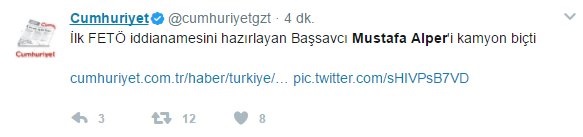 Cumhuriyet, resmi Twitter hesabı üzerinden de kaza haberini aynı başlıkla takipçilerine duyurdu. Söz konusu tweette de "İlk FETÖ iddianamesini hazırlayan Başsavcı Mustafa Alper'i kamyon biçti" ifadesi yer aldı.