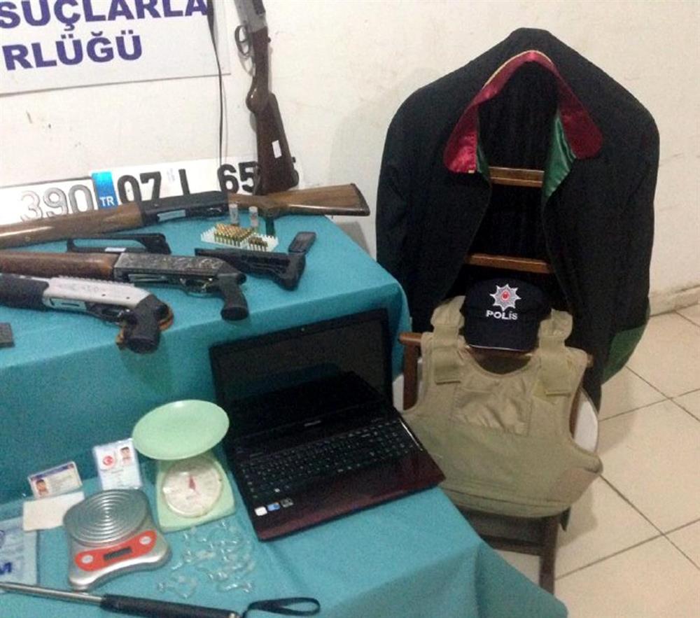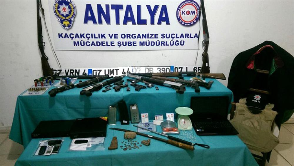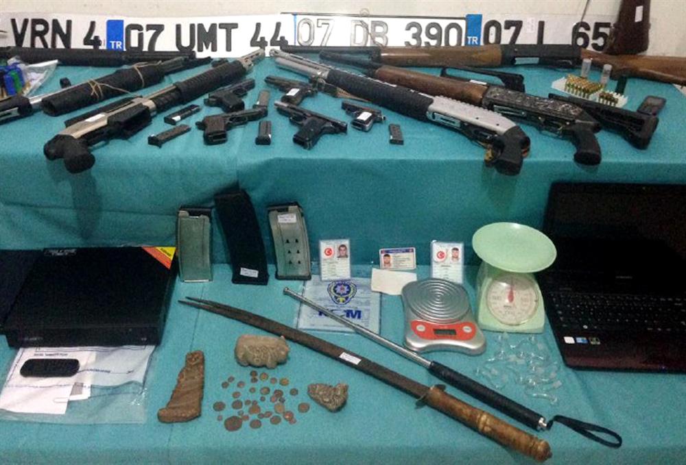 Şüphelilerin kaldıkları ve saklandıkları yerde yapılan aramalarda 5 değişik çap ve markada ruhsatsız tabanca, 9 otomatik av tüfeği, avukat cübbesi, polis şapkası, işkence yapılırken kullanılan düzenek, çelik yelek, açılır kapanır çelik cop, kılıç, 8 sahte araç plakası, 2 sahte nüfus cüzdanı, 1 sahte sürücü belgesi, 3 tarihi heykel, 30 sikke, 77 değişik çapta tabanca fişeği, 127 değişik marka ve çapta av tüfeği fişeği, 8 şarjör, 3 hassas terazi, 2 güvenlik kamera kayıt cihazı, çok sayıda veri depolama cihazı, doküman ve cep telefonları, 5 kök kenevir, 2.17 gram eroin, 14.43 gram metamfetamin maddesi ile uyuşturucu madde kullanmak için hazırlanmış düzenek ele geçirildi.