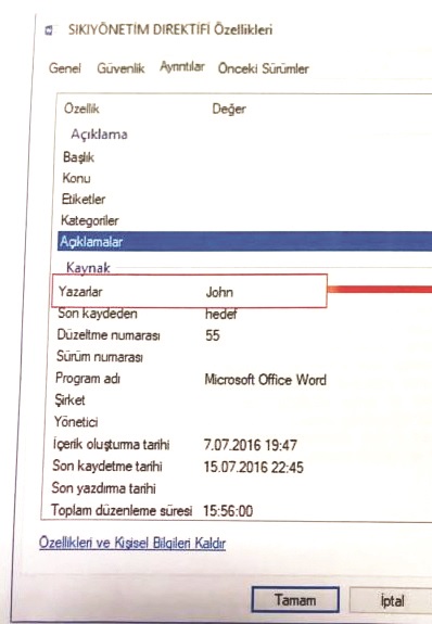 Word belgesinin meta/data bilgilerinin incelenmesi sonucunda da dikkat çekici bir bulguya ulaşıldı. Yazarlar bölümünde "John" isminin yazılı olduğu görüldü. Buna göre, söz konusu belgenin "John" isimli bilgisayar kullanıcısı tarafından hazırlandığı belirlendi. Genelkurmay Başkanlığı'nda yapılan araştırmalarda "John" isminde bir bilgisayar kullanıcısı tespit edilemezken, bu da darbe direktiflerinin Genelkurmay Başkanlığı dışındaki bir bilgisayarda hazırlandığını ortaya koydu.