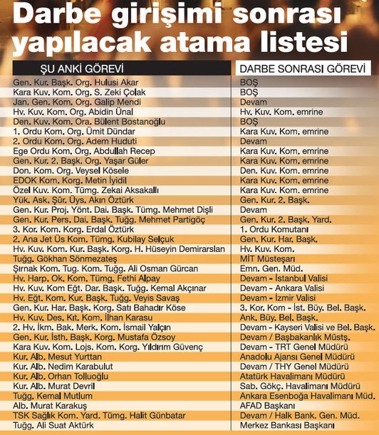 Habertürk'te yer alan habere göre, listenin başında, darbe gecesi hainler tarafından rehin alınan Genelkurmay Başkanı Hulusi Akar'ın isminin yanındaki bölümün 'BOŞ' bırakıldığı görüldü. Yine listenin ikinci sırasında yer alan Kara Kuvvetler Komutanı Salih Zeki Çolak'ın da atandığı yerin 'BOŞ' bırakıldığı dikkat çekti. Darbe girişimi sonrası rahatsızlığı nedeniyle görevi bırakan Jandarma Genel Komutanı Galip Mendi ve darbe girişimi soruşturması kapsamında tutuklanan 2. Ordu Komutanı Adem Huduti'nin isimlerinin karşısında ise 'Devam' yazıldığı belirlendi. Genelkurmay 2. Başkanı Yaşar Güler, 1. Ordu Komutanı Ümit Dündar, Ege Ordu Komutanı Abdullah Recep ve Özel Kuvvetler Komutanı Zekai Aksakallı'nın ise darbecilerin atama listesinde bulundukları görevlerden alınıp Kara Kuvvetler Komutanlığı emrine verildikleri tespit edildi.