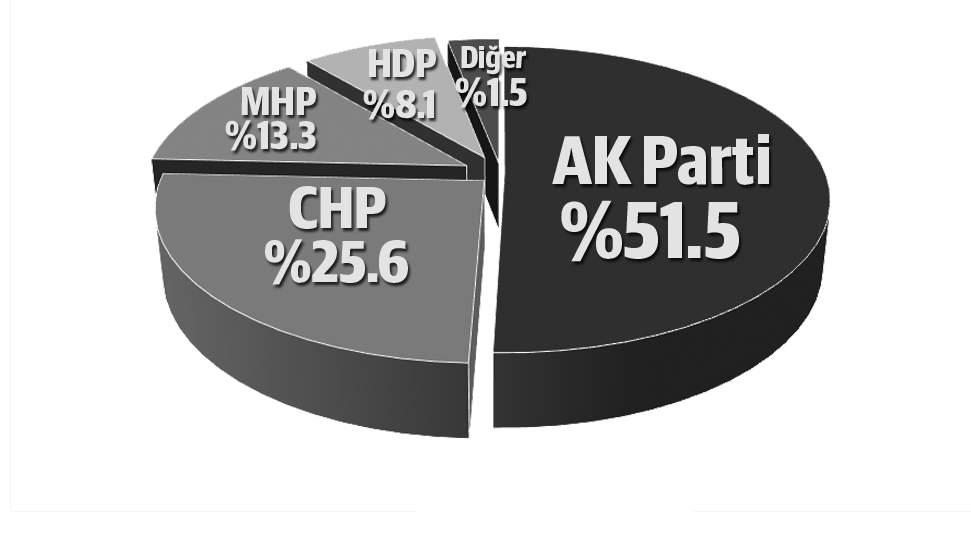 “Bugün bir milletvekili seçimi olsa oyunuzu hangi partiye verirsiniz?" sorusuna katılımcıların yüzde 51.5'i AK Parti, yüzde 25.6'sı CHP, yüzde 13.3'ü MHP, yüzde 8.1'i HDP yanıtını verdi.