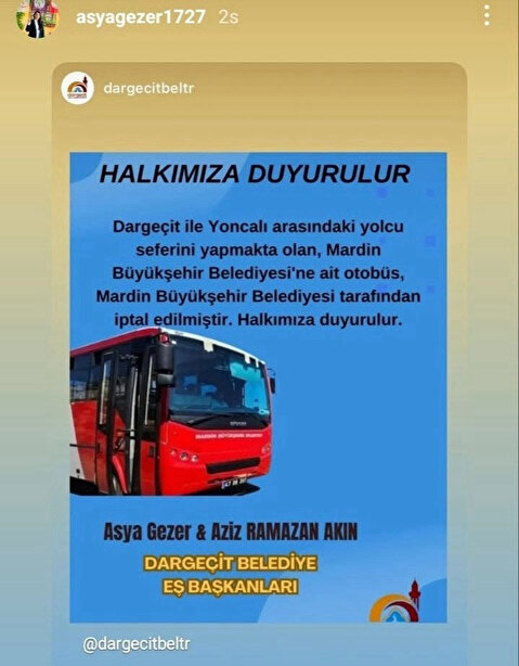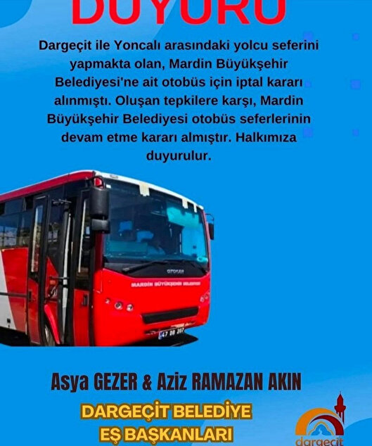"Dargeçit ile Yoncalı arasındaki yolcu seferini yapmakta olan Mardin Büyükşehir Belediyesine ait otobüs için iptal karan alınmıştır. Oluşan tepkilere karşı Mardin Büyükşehir Belediyesi otobüs seferlerinin devam etme karan alınmıştır. Halkımıza duyurulur. Dargeçit Belediye Eş Başkanları Asya Gezer ve Aziz Ramazan Akın"
