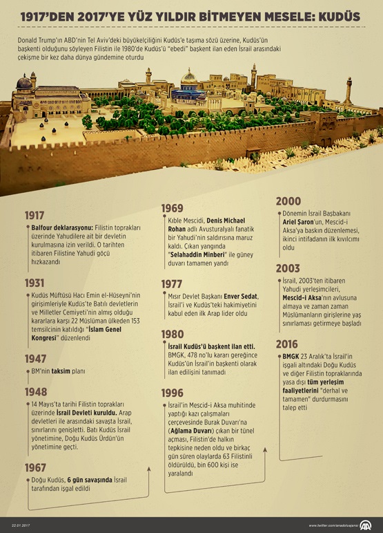 - Beyaz Saray, ABD Başkanı Donalp Trump'ın, "ABD'nin Kudüs'ü İsrail'in başkenti olarak tanıdığını ilan edeceğini" ve "Tel Aviv'deki Amerikan Büyükelçiliğinin Kudüs'e taşınması talimatı verdiğini söyleyeceğini" açıkladı. Bunun üzerine başkenti Kudüs olan Filistin ile 1980’de Kudüs’ü “ebedi” başkent ilan eden İsrail arasındaki çekişme bir kez daha dünya gündemine oturdu.
