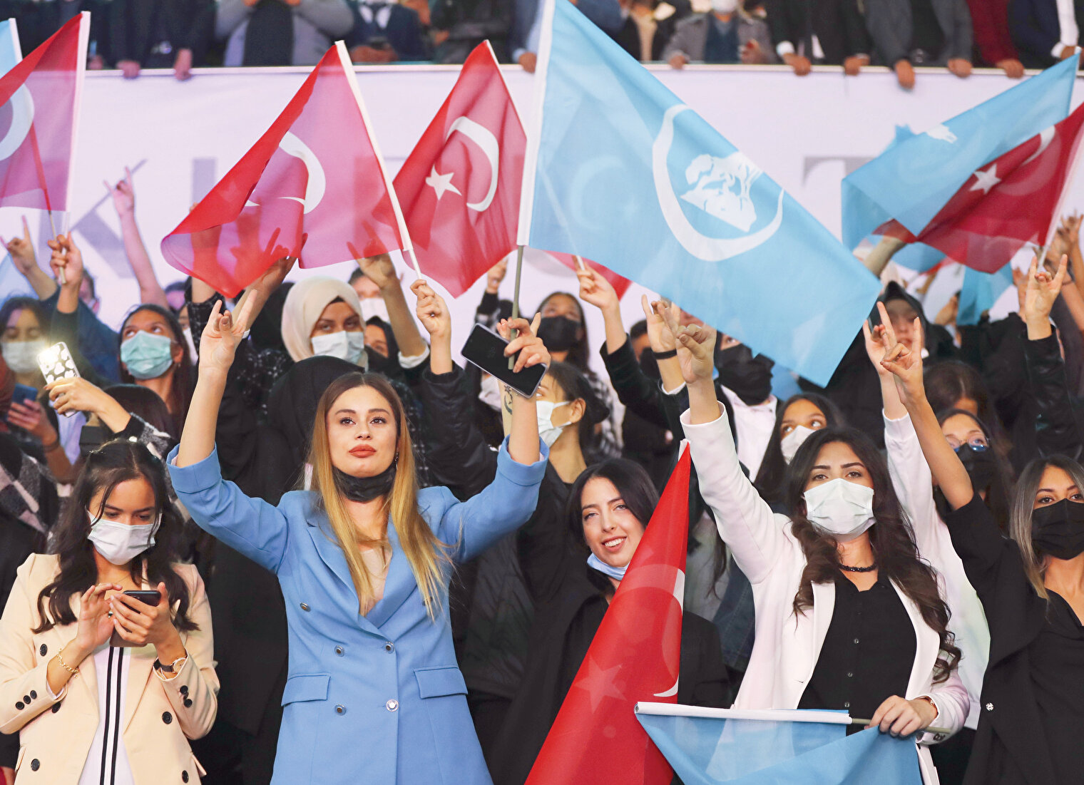 “Hareketin lideri Devlet Bahçeli” ve “Ülkücü hareket engellenemez” sloganlarının atıldığı kurultay salonunda, “Cumhuriyete yüzyıllık yemin ülküye ömürlük sadakat” yazılı pankart yer aldı.