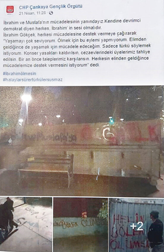 CHP’de DHKP/C savunuculuğu gençlik kollarına da sıçradı. CHP Gençlik Kolları üyesi 3 kişi, açlık grevi neticesinde ölen terör örgütü DHKP-C sempatizanı Grup Yorum üyesi Helin Bölek’in adını parkın duvarına yazdı. DHKP-C terör örgütüne yakınlığıyla bilinen Grup Yorum üyesi Helin Bölek, açlık grevi sonucunda 3 Nisan’da ölmüştü. CHP ise Savcı Mehmet Selim Kiraz’ı katleden eli kanlı terör örgütü sempatizanı Bölek’in ölümüne sahip çıkmaya devam ediyor. Ankara Abdi İpekçi Parkı’nın duvarına 21 Nisan günü “Helin Bölek ölümsüzdür” şeklinde yazı yazdığı tespit edilen şahısların CHP Çankaya Gençlik Kolları üyesi olduğu tespit edildi. Eyleme ilişkin fotoğrafların CHP Çankaya Gençlik Kolları’nın sosyal medya hesabından da paylaşılması dikkat çekerken, şüpheliler hakkında, ‘terör örgütü propagandası yapmak ve kamu malına zarar vermek’ suçlarından soruşturma açıldı. Ankara Emniyeti’ndeki sorguları sonrası CHP üyesi zanlılar, çıkarıldıkları mahkeme tarafından adli kontrolle serbest bırakıldı.