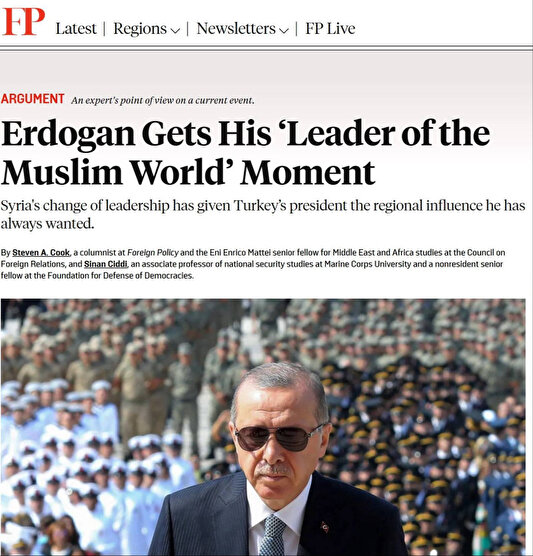 "Suriye'deki liderlik değişimi, Türkiye Cumhurbaşkanı'na her zaman istediği bölgesel nüfuzu kazandırdı. Şimdi Erdoğan, Esad iktidarda olmadan Suriye'nin geleceğini belirlemek için yeni ve etkili bir konumda buluyor kendini. Kendisini ve ülkesini Arap ve Müslüman ülkelerin doğal liderleri olarak görüyor."