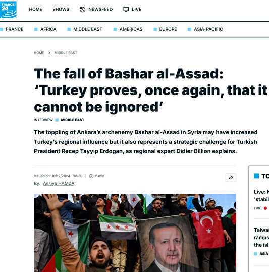 "Ankara'nın Suriye'deki baş düşmanı Beşşar Esad'ın devrilmesi, Türkiye'nin bölgedeki nüfuzunu artırmış olabilir ancak bölge uzmanı Didier Billion'un da belirttiği gibi, aynı zamanda Türkiye Cumhurbaşkanı Recep Tayyip Erdoğan için stratejik bir meydan okuma anlamına geliyor."