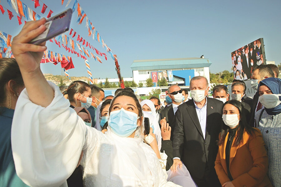 Erdoğan, “Ülke ve dünya meseleleri ile ilgili her konuda biz kulağımızı da gönlümüzü de milletimize çeviriyoruz. Siz ne diyorsanız ne istiyorsanız ne bekliyorsanız onu yapmak için gece gündüz çalışıyoruz. Sorumluluklarımızın ağırlığına ve çokluğuna rağmen halkımızla muhabbetimizi bu derece sıkı tutarken dikkat ederseniz muhalefet, milletimizden olabildiği kadar uzak duruyor” dedi. Erdoğan, Ankara’da, İstanbul’da kapalı kapılar ardından siyaset yapmanın kolay olduğunu dile getirdi. Siyasetin gerçek er meydanının 81 vilayetin tamamı olduğuna dikkati çeken Erdoğan, “Şehirlerimize gidip milletimizle kucaklaşmadan, insanımızın gönül sıcaklığını hissetmeden siyaset yapıyorum diyenler emin olun sufleyi sizden değil başka yerlerden alıyor. Milletimizin karşısına çıkıp bu ülke için yaptıklarını, yapacaklarını, içerideki ve dışarıdaki her meseleyle ilgili duruşunu açık yüreklilikle ortaya koyamayandan siyasetçi olmaz. Yalan, iftira, dedikoduyla, ima ile siyaset yapanların halktan uzak durmasının sebebi bu sığ ve çirkin üsluplarının yüzlerine vurulacağını bilmeleridir” diye konuştu.