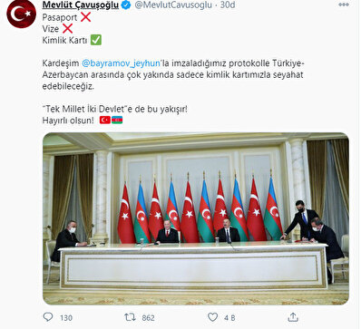 Dışişleri Bakanı Mevlüt Çavuşoğlu,Twitter hesabından yaptığı açıklamada "Kardeşim Ceyhun Bayramov ile imzaladığımız protokolle Türkiye-Azerbaycan arasında çok yakında sadece kimlik kartımızla seyahat edebileceğiz. “Tek Millet İki Devlet”e de bu yakışır! Hayırlı olsun! "dedi.