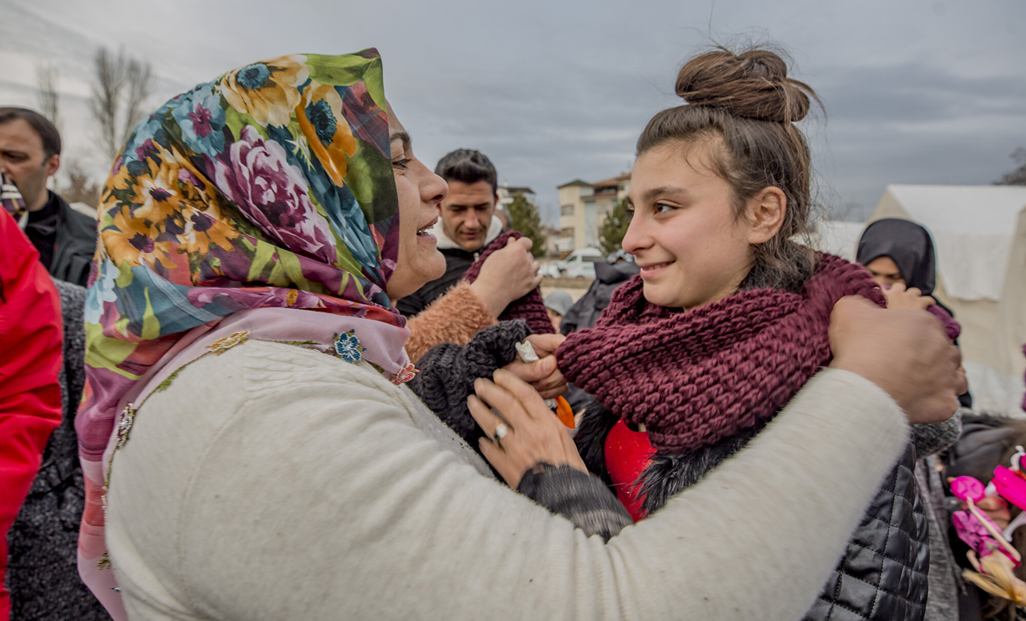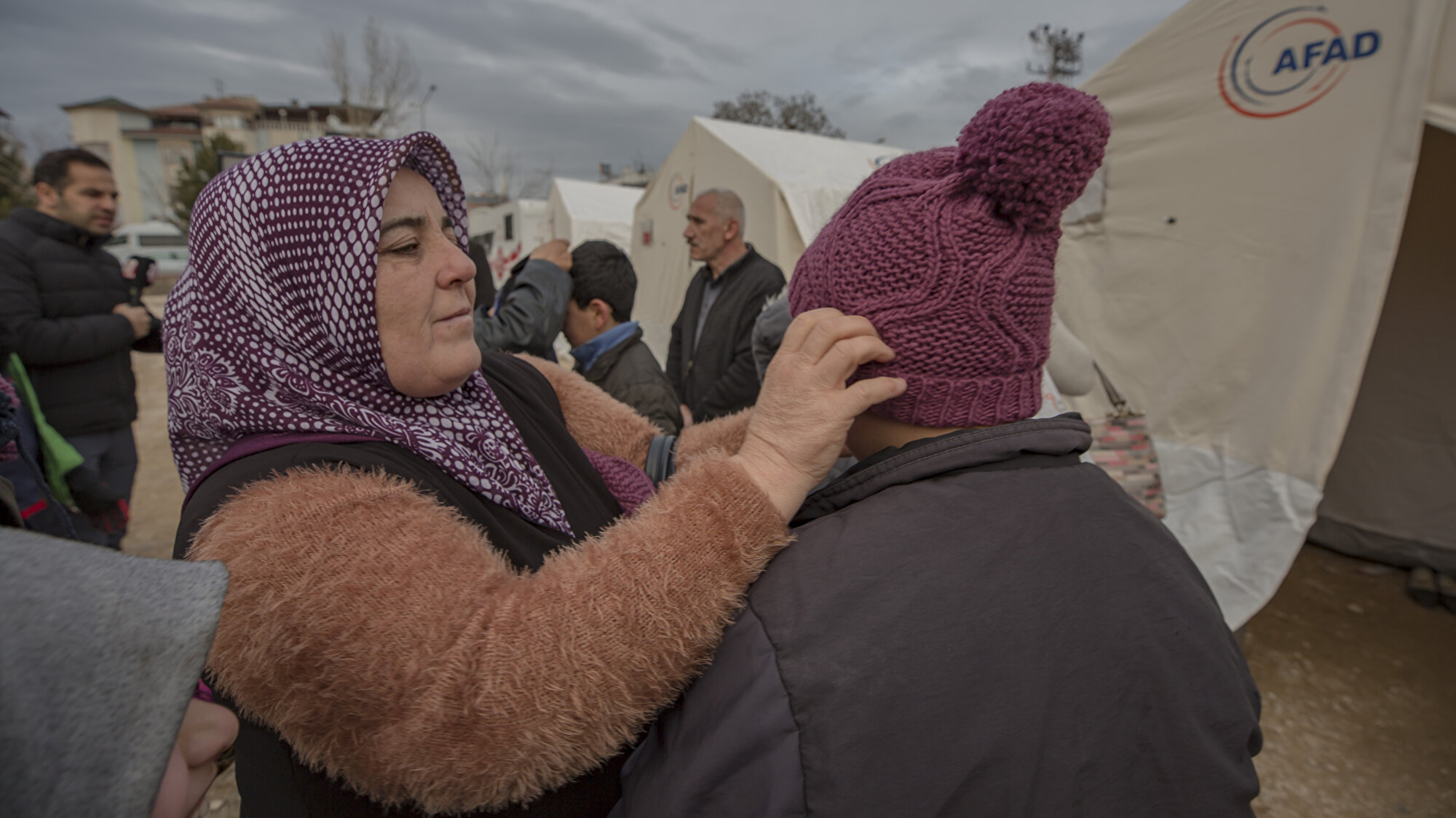 Diyarbakır anneleri, Bahçelievler Mahallesi'nde AFAD ve Türk Kızılay'ı tarafından depremzedeler için kurulan çadır kente ziyarette bulunarak, depremden etkilenenlere Diyarbakır'da evlat nöbetindeyken ördükleri atkı, bere ve eldivenleri verdi.