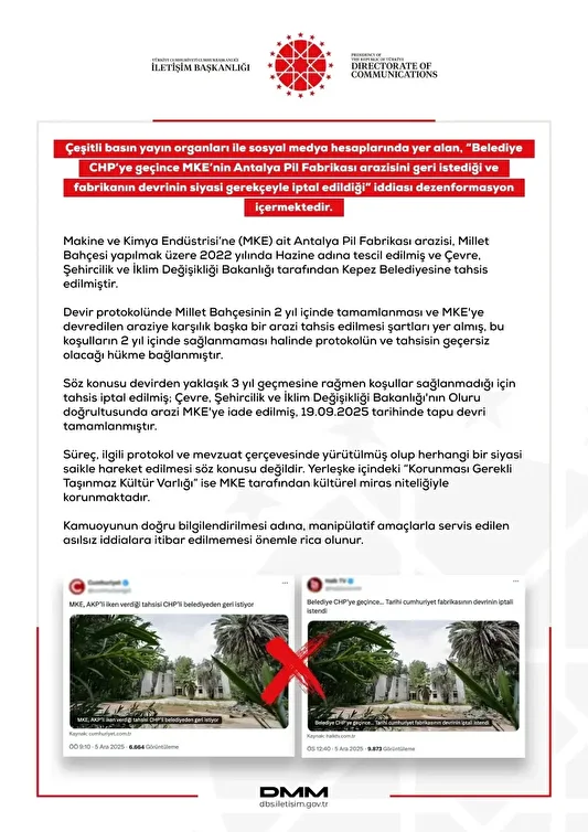 Cumhurbaşkanlığı İletişim Başkanlığı Dezenformasyonla Mücadele Merkezi (DMM), "Makine ve Kimya Endüstrisi (MKE) kurumunun, Antalya Pil Fabrikası arazisini geri istediği ve fabrikanın devrinin siyasi gerekçeyle iptal edildiği" iddiasının doğru olmadığını bildirdi. DMM'den yapılan açıklamada; "Makine ve Kimya Endüstrisine (MKE) ait Antalya Pil Fabrikası arazisi, millet bahçesi yapılmak üzere 2022 yılında Hazine adına tescil edilmiş ve Çevre, Şehircilik ve İklim Değişikliği Bakanlığı tarafından Kepez Belediyesine tahsis edilmiştir. Devir protokolünde millet bahçesinin 2 yıl içinde tamamlanması ve MKE'ye devredilen araziye karşılık başka bir arazi tahsis edilmesi şartları yer almış, bu koşulların 2 yıl içinde sağlanmaması halinde protokolün ve tahsisin geçersiz olacağı hükme bağlanmıştır. Süreç, ilgili protokol ve mevzuat çerçevesinde yürütülmüş olup herhangi bir siyasi saikle hareket edilmesi söz konusu değildir" ifadeleri kullanıldı.