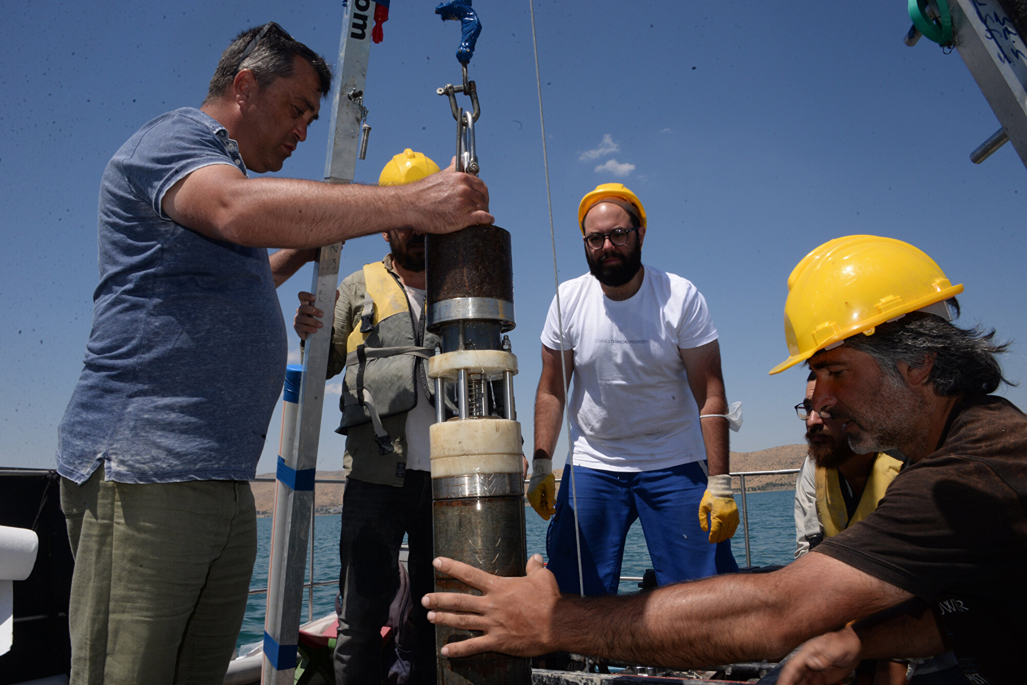 - "Hazar gölü ve çevresinin depremsellik riskini araştırıyoruz. Bu modüler platform üzerinde Hazar Gölü'nde binlerce yıllık göl tabanında çökelen sedimentleri örnekleyerek bu bölgede geçmişte meydana gelen depremlerin kayıtlarını araştırıyoruz ve ortaya çıkartmaya çalışıyoruz. Karotiel sistemle göl tabanlarını hiç bozmadan, sedimenti bozmadan numune alıyoruz. Bu sayede yaklaşık 6 metreye yakın örnekleme yapabiliyoruz. Aldığımız bu örnekleri, karotları açarak, geçmişte meydana gelen depremlerin oluşturduğu izleri çeşitli parametrelerle ortaya çıkararak bunları radyokarbon yaşlandırma teknikleri kullanarak geçmişteki depremlerin tarihlerini ortaya çıkartıyoruz. Dolayısıyla sonunda deprem tekrarlanma aralıklarını ortaya çıkarabiliyoruz. Bu bize Doğu Anadolu fayının bu bölge üzerinde geçen segmenti üzerinde meydana gelen geçmişteki depremlerin ne kadar sıklıkta meydana geldiğini ve dolayısıyla da gelecekte ne kadar sıklıkta bu depremlerin oluşabileceğini tahmin edebiliyoruz. Depremin zamanını tabi bilmek mümkün değil, fakat bu paleosismoloji dediğimiz yöntemde, özellikle su altı paleosismolojinde denizlerde ve göllerde uygulanan ve yüzde 90 sonuç alınabilen önemli bir yöntem."