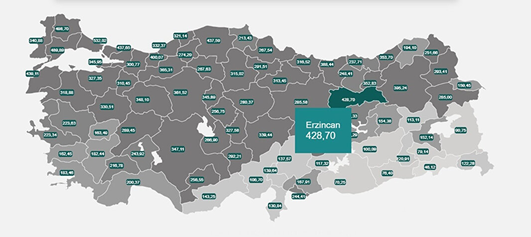 Sağlık Bakanlığı, illere göre 7 günlük her 100 bin kişide görülen Kovid-19 güncel vaka sayılarını açıkladı. Erzincan 428,70 ile Doğu Anadolu Bölgesi’ndeki 14 il arasında vaka sayısının en yüksek olduğu kent oldu.