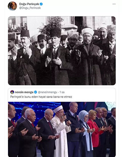 Perinçek ise Mengü'ye Atatürk'ün dua ederken çekilmiş bir fotoğrafıyla yanıt verdi.
