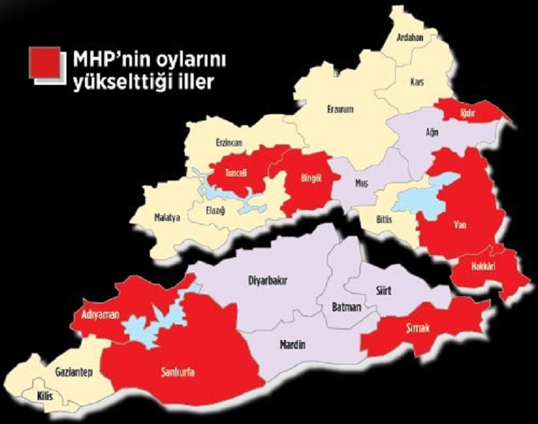Çukurca’da yüzde 11.3 oy alan MHP bu ilçede 3. parti olarak büyük bir şaşkınlık yarattı. Şanlıurfa’nın Harran İlçesi’nde yüzde 48.8’lik oy oranıyla birinci çıkan MHP, Tunceli’nin Pertek İlçesi’nde ise yüzde 8.5 oy almayı başardı. MHP, Şırnak’ta oy oranını yüzde 1.4’ten yüzde 4 çıkardı.