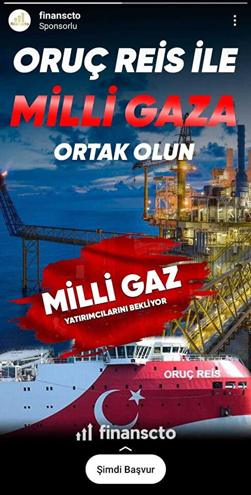 Dolandırıcılar bu kez de geçtiğimiz aylarda Karadeniz'de bulunan doğalgaz rezervini öne sürüp 'milli gaza ortak ol' reklamları ile yatırımcıları tuzağa düşürmeye çalışıyor. Oruç Reis sismik gemisinin fotoğraflarını kullanarak sosyal medyada reklam yapan dolandırıcılar çıkacak gaza ortak olma vaadinde bulunuyor.