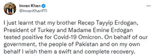 Pakistan Başbakanı İmran Han da paylaşımında, "Kardeşim Cumhurbaşkanı Erdoğan ve eşinin koronavirüs testinin pozitif çıktığını öğrendim" dedi. Han, ülkesi ve Pakistan halkı adına acil şifalar diledi.