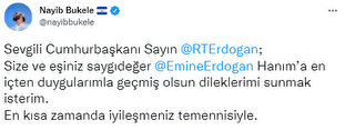 El Salvador Devlet Başkanı Nayib Bukele , "Sevgili Cumhurbaşkanı Sayın Recep Tayyip Erdoğan size ve eşiniz saygıdeğer Emine Erdoğan hanıma en içten duygularımla geçmiş olsun dileklerimi sunmak isterim. En kısa zamanda iyileşmeniz temennisiyle" paylaşımını yaptı.