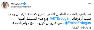 Al Sani mesajında, "Değerli kardeşim Cumhurbaşkanı Recep Tayyip Erdoğan ve eşi Emine hanıma acil şifalar, sağlık ve sıhhat dilerim" dedi.
