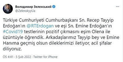 Devlet Başkanı Zelenskiy, "Arkadaşlarımız Tayyip Bey ve Emine Hanım'a geçmiş olsun dileklerimizi iletiyor, acil şifalar diliyoruz" dedi.