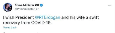 Yunanistan Başbakanı Kiriakos Miçotakis, sosyal medya hesabından Cumhurbaşkanı Erdoğan ve eşi Emine Erdoğan'a geçmiş olsun dileğinde bulundu. Miçotakis, "Cumhurbaşkanı Erdoğan ve eşine acil şifalar diliyorum" dedi.