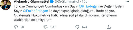 Guatemala Cumhurbaşkanı Alejandro Giammattei, ''Twitter hesabından paylaştığı mesajında, Türkiye Cumhuriyeti Cumhurbaşkanı Sayın @RTErdogan ve Değerli Eşleri Sayın @EmineErdogan ile dayanışma içinde olduğumu ifade ediyor, Guatemala Hükümeti ve halkı adına acil şifalar diliyorum. Kendilerini uzaklardan selamlıyorum'' açıklamasında bulundu.