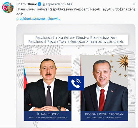 Cumhurbaşkanlığının Twitter hesabından yapılan paylaşımda, Azerbaycan Cumhurbaşkanı Aliyev'in COVID-19 testi pozitif çıkan Cumhurbaşkanı Erdoğan ve eşi Emine Erdoğan için "geçmiş olsun" temennilerini ilettiği belirtildi.