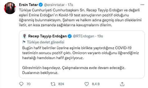 Tatar, Twitter hesabından Cumhurbaşkanı Erdoğan'ın testinin pozitif çıktığına ilişkin sosyal medyadan yayımladığı mesajını alıntılayarak, "Türkiye Cumhuriyeti Cumhurbaşkanı Sayın Recep Tayyip Erdoğan ve değerli eşleri Emine Erdoğan’ın COVID-19 test sonuçlarının pozitif olduğunu öğrenmiş bulunmaktayım. Şahsım ve halkım adına geçmiş olsun dileklerimi iletir, en kısa zamanda sağlıklarına kavuşmalarını dilerim" dedi.