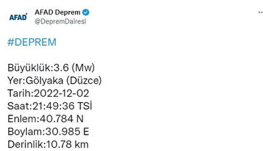 AFAD açıklamasına göre; Düzce'nin Gölyaka ilçesinde 3.6 şiddetinde deprem meydana geldi.