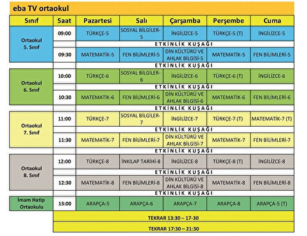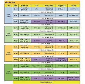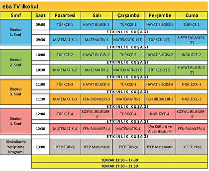 - Yayınlar aynı kanalda ve gün içinde 1 veya 2 kez tekrar edilecek. "eba.gov.tr" içeriklerin kayıtlarına ulaşılabilecek.