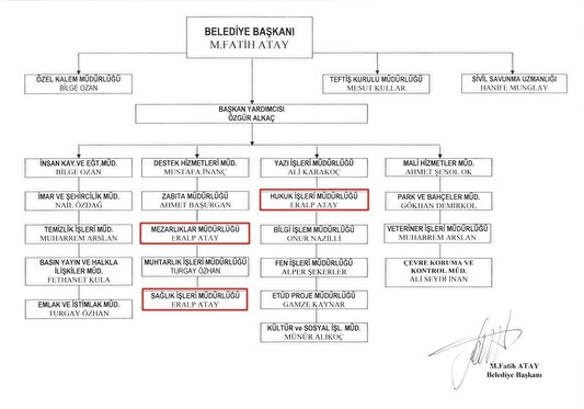 - Başkan seçildikten sonra DSİ Bölge Müdürlüğü’nde kurum hekimi olarak görevli kardeşi Dr. Eralp Atay’ı, hukuk işleri müdürlüğü dahil olmak üzere 3 ayrı birimin müdürlüğüne, oğlunu da belediyenin spor kulübünün başına getirdi.
