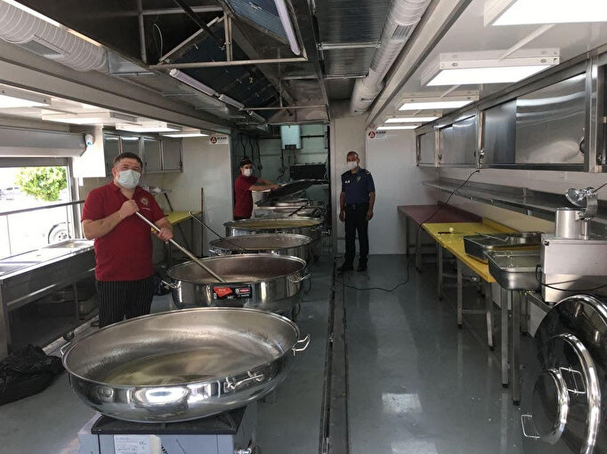 Güvenlik Daire Başkanlığı bünyesindeki mobil mutfak tırlarından Sosyal Hizmetler ve Sağlık Daire Başkanlığı koordinasyonunda yemek dağıtımı yapılacak. Bir Mobil Mutfak, bir öğünde 5 bin kişiye yemek dağıtımı yapabilme kapasitesine sahip. İki tırda, bir öğünde toplam 10 bin kişilik yemek çıkarılıyor. Vatandaşlara, 3 öğün yemek dağıtımı yapılacak şekilde hizmet verilecek.