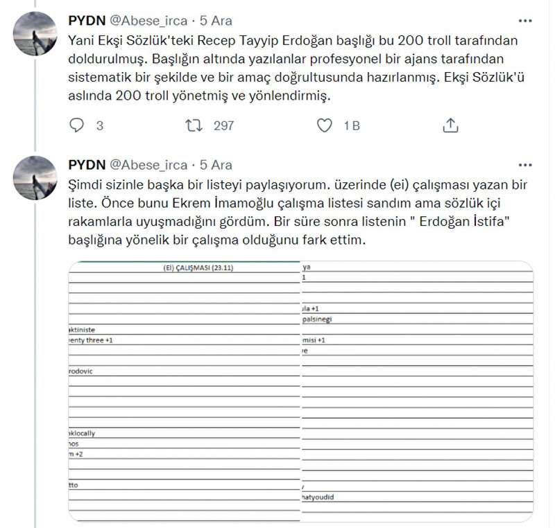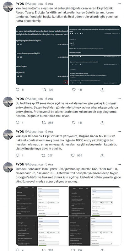 Ekşi Sözlük'te bulunan 200 kişilik troll ağının sosyal medyada sistematik olarak kara propaganda faaliyetleri yürüttüğü ortaya çıktı. Provokatif yayınları ve iftiraya kadar varan algı operasyonları yapılan portalda Ekrem İmamoğlu'nu, İBB'yi, CHP'yi ve Kılıçdaroğlu'nu eleştiren hesaplar engellenirken başta Cumhurbaşkanı Recep Tayyip Erdoğan olmak üzere diğer bakan ve devlet görevlilerine hakaret seviyelerine ulaşan entrylere göz yumuluyor.