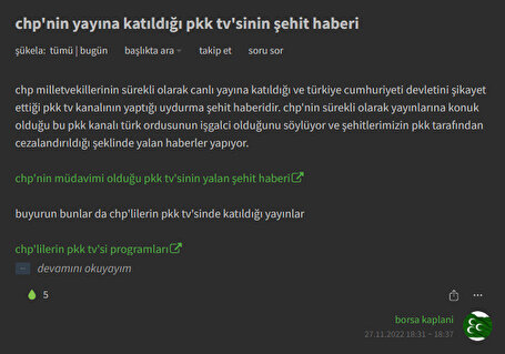 Bu şekilde Eksi Sözlük'te CHP’li vekilin, terör örgütü PKK’nın kanalında yayına katıldığı bilgisinin yayılması engelleniyor.