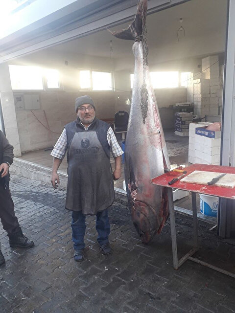 Kütahya’nın Emet ilçesinde bir balıkçı tarafından sergilenen yaklaşık 2 metre uzunluğunda, 250 kilogram ağırlığındaki orkinos balığı dikkatleri üzerine çekti.