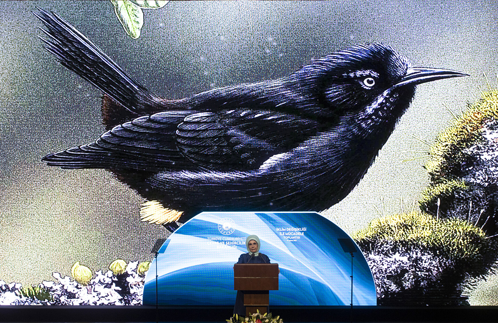 Konuşması sırasında Havai adalarında nesli tükenen endemik bir kuş türünün, 1987'de kaydedilen son sesini dinleten Emine Erdoğan, "Bu kuş türü, dişilerin ve erkeklerin birbirlerine söyledikleri şarkılarla meşhurdu. Fakat yaşadıkları bölgeye insanların gelip, yeni virüsler getirmesi ve küresel ısınmayla, değişen dengelere yenik düştüler. Sonra, tek tek dünyadan ayrıldılar. Onlar artık yalnızca masallarda yaşayacaklar. Dinleyeceğimiz ses, hayatta yapayalnız kaldığını bilmeyen, son erkek kuşun, son şarkısıydı. O, tüm letafetiyle hiç gelmeyecek eşini çağırırken, bizlere yeryüzünün en acıklı melodisini bıraktı." diye konuştu.
