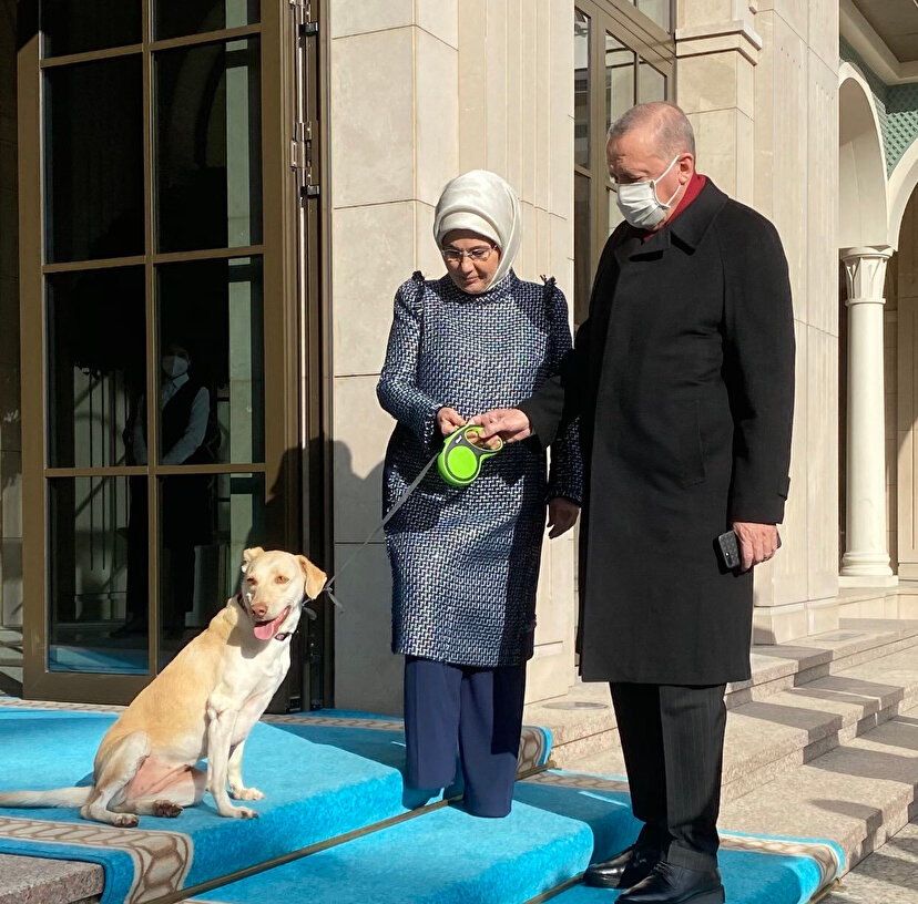 Emine Erdoğan, Cumhurbaşkanı Erdoğan'ı hayvan barınağından sahiplendiği köpekle, Ankara'daki Cumhurbaşkanlığı Külliyesi'nden mesaiye uğurladı.