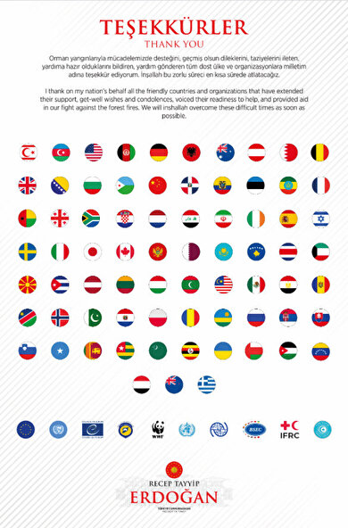 “Türkiye’nin orman yangınlarıyla mücadelemizde desteğini, geçmiş olsun dileklerini, taziyelerini ileten, yardıma hazır olduklarını bildiren, yardım gönderen tüm dost ülke ve organizasyonlara milletim adına teşekkür ediyorum”