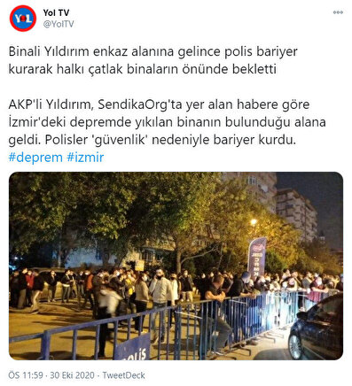 Ancak Yol TV, Binali Yıldırım'ın bölgeye gelişini "polis bariyer kurarak halkı çatlak binaların önünde bekletti" ifadesiyle duyurdu. Enkaz altındaki insanları arama kurtarma çalışmalarının sağlıklı bir şekilde yürütülmesi ve vatandaşların güvenliği için kurulan barikatın, Yol TV tarafından çarpıtılarak yansıtılması vatandaşların tepkisini topladı.