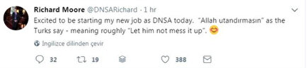 Moore büyükelçilik görevinden sonra İngiltere Ulusal Güvenlik Danışmanı Yardımcısı (DNSA) olarak çalışmaya başlamış bu görevini ise , 'DNSA'daki işime bugün başlayacağım için çok heyecanlıyım. Türkler gibi söylemek gerekirse "Allah utandırmasın" tweetiyle duyurmuştu.